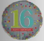 A round foil balloon featuring 16 HAPPY BIRTHDAY.