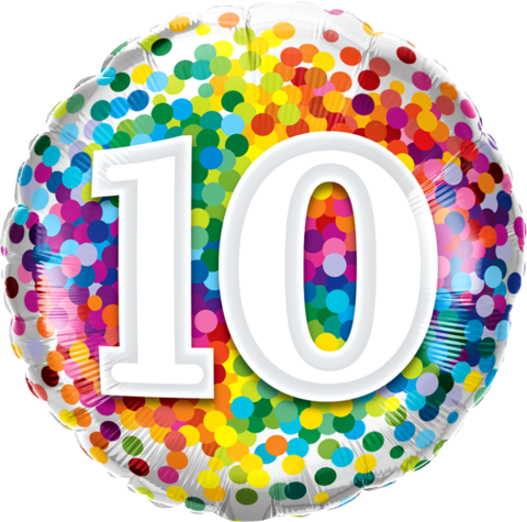 Say Happy 10th Birthday with this Bright multi coloured confetti looking foil 45cm balloon with a 10 on either side.