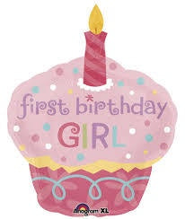 A Cupcake supershape foil balloons featuring message FIRST BIRTHDAY GIRL in Pinks.