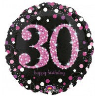 Balloon is a black background with magenta, purple & white dots surrounding a big sparkling 30.