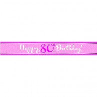 Happy 80th Birthday pink foil banner. Great for decorating doors and windows, can even be used as a table runner. Message is Repeats 3 times.