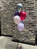 Helium Balloon Bouquet, includes 6 x 30cm balloons with Hi-Float on a Balloon weight coloured to match your balloons. These balloons will last for 2-3 days.